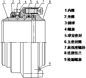 鋼制旋轉(zhuǎn)接頭主要由內(nèi)圈、外圈、法蘭、主密封件、滾道密封、鋼球和聯(lián)接螺栓等零件組成(見(jiàn)下圖)